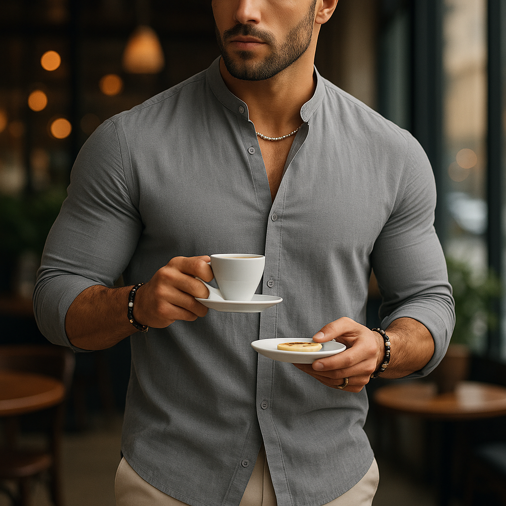 The Vanta Collarless Shirt combines a sleek mandarin collar with a tailored athletic fit, delivering a modern, confident look that moves with you. Made from breathable, stretch-infused cotton, it's perfect for casual refinement or dressed-up versatility.